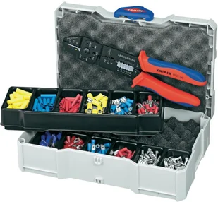 W TANOS MINI-systainer(R) (sztywna walizka z tworzywa sztucznego)$70 Zlacze T-Loc do obslugi jedna reka: jeden obrót zlaczki systainer(R) otwiera lub zamyka polaczenie z druga zlaczka systainer(R).$71 Open Linked Condition: latwy i szybki dostep do zawartosci, bez rozmontowywania zlacza$72 Dwie wkladki z tworzywa sztucznego z 6 przegródkami na koncówki$73 Wyposazony w liczne uzyteczne koncówki kablowe. Z zagniatarka Knipex 97 22 240.