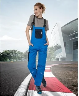 DAMSKIE OGRODNICZKI H9318 H9410. Damski fason i sylwetka, elastyczne szelki. Kieszeń na suwak na piersi. 2 przednie kieszenie. 2 tylne naszyte kieszenie. Wielofunkcyjne kieszenie na narzędzia. Podwójny materiał na kolanach.