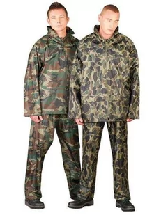 Komplet przeciwdeszczowy w skład którego wchodzą spodnie do pasa i kurtka.