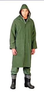 Płaszcz przeciwdeszczowy z kapturem. 65% PVC, 35% poliester zapinany na suwak z dodatkowymi zapięciami na napy kaptur ściągany na troczki dwie kieszenie zewnętrzne ściągacz w rękawach zabezpieczający przed wiatrem system wentylac