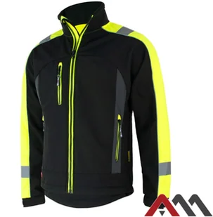 Kurtka typu softshell o wyjątkowo atrakcyjnym wzornictwie, wykonana z: 94% poliester + 6 % spandex z powłoką TPU, gramatura 320 g/m2 +/- 10g/m2, zapewnia doskonałą ochronę przed deszczem (3000mm słupa wody) i wiatrem. Charakterystyka: pasy i bizy odblaskowe na rękawach i ramionach, zapinana na suwak, od wewnątrz osłonięty klapą chroniącą przed wiatrem, posiada 3 kieszenie zewnętrzne - 2 duże boczne, 1 na klatce piersiowej (tzw. Napoleońska), wszystkie zapinane na suwak, wykończona pod szyją stójką z miękkim materiałem od wewnątrz, regulowany dół kurtki za pomocą elastycznego sznurka i stoperów- pozwala dokładnie dopasować kurtkę do sylwetki, rękawy regulowane za pomocą rzepa. Kolor: czarno-żółty fluorescencyjny z pasami odblaskowymi Dostępne rozmiary: