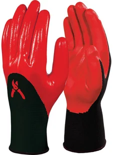 Rękawica z poliestru 100%. Powłoka nitrylowa na stronie chwytnej, palcach i do połowy strony grzbietowej. Rękawica w kolorze czerwonym, rozmiar 10. Odporna na oleje i smary z powłoką nieprzemakalną. Zapewnia dużą manualność i dobry chwyt.