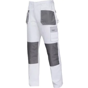 Spodnie robocze do pasa polskiego producenta marki Lahti Pro. Spodnie uszyto z bardzo mocnej i wytrzymałej na rozdarcia bawełny o wysokiej gramaturze 240 g/m2. Spodnie robocze do pasa w kolorze białym z szarymi wstawkami. W modelu znajdziemy 9 kieszeni w tym 6 zapinanych na rzep. Dodatkowo jest kieszeń na telefon komórkowy praz szlufka na młotek.