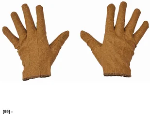 Beżowe rękawice szyte z bawełnianej dzianiny, pokryte warstwą winylu.