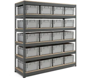 Kompletny regał z mocnymi półkami z regulacją wysokości, idealny do magazynu, warsztatu i innych środowisk przemysłowych. Regał dostarczany jest z pojemnikami plastikowymi EURO. Łatwy montaż bez śrub. Poręczne połączenie regałów do przechowywania i pojemników to optymalne rozwiązanie do warsztatów, magazynów i środowisk przemysłowych. Ramy regałów i belki nośne wykonane są z trwałego metalu i wyposażone w półki z trwałej płyty wiórowej 16 mm, które wytrzymują duże obciążenia oraz intensywne, codzienne użytkowanie. Wysokość półek można łatwo regulować zgodnie z potrzebami w zakresie przechowywania. Regał jest łatwy w montażu i nie wymaga użycia śrub ani obecności stężeń tyłu i boków.