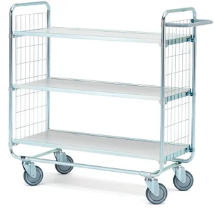 Lekko toczący się wózek półkowy z rur stalowych. Dwie ramy z siatki stalowej i trzy półki z laminatu z bezstopniową regulacją wysokości. Wyposażony w wygodny uchwyt i cztery lekko toczące się koła dla łatwego manewrowania. Funkcjonalny wózek z półkami. Niezwykle mocny i wytrzymały.