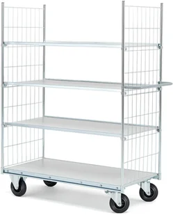 Wszechstronny wózek z podwoziem z galwanizowanej stali. Wózek posiada dwie wysokie amy z siatki i cztery półki, w tym trzy z możliwością regulacji wysokości. Wygodny uchwyt na jednym z boków ułatwia manewrowanie wózkiem. Funkcjonalny wózek z półkami. Niezwykle mocny i wytrzymały.
