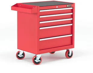 Lakierowany proszkowo wózek narzędziowy z zamykanymi szufladami. Wyposaż swój warsztat w praktyczny i trwały wózek narzędziowy. Wózek pomaga lepiej zorganizować pracę i przechowywanie dzięki łatwemu przeglądowi i dostępowi do zawartości. Wózek narzędziowy pokryto lakierem proszkowym w żywym odcieniu czerwieni. Posiada pięć szuflad, które płynnie pracują dzięki prowadnicom na łożyskach kulkowych.