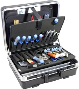 Walizka narzędziowa z wytrzymałego materiału ABS Solidna aluminiowa rama z zabezpieczeniem kantów chroni narzędzia i walizkę. 2 zamki oraz zamek cyfrowy B&W PROFIcode zapewniają bezpieczeństwo. 4 dodatkowe nóżki zapewnią, że pokrywa się nie porysuje a walizka lepiej stoi. Trwały, wygodny uchwyt zapewnia komfort noszenia walizki. Dolna pokrywa regulowana nowymi aluminiowymi przegródkami (2 aluminiowe przegródki, 4 końcówki, 2 przekładki). Flex pockets posiada wyciąganą tackę narzędziową w pokrywie z z 22 kieszonkami na narzędzia z przodu i z tyłu i wyciąganą wkładka na dno z 15 kieszeniami na narzędzia.