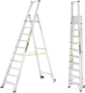 Wolnostojąca drabina profesjonalna z wejściem jednostronnym + możliwość przeznaczenia jako: drabina montażowa, drabina magazynowa i drabina budowlana + koła w standardowym wyposażeniu.