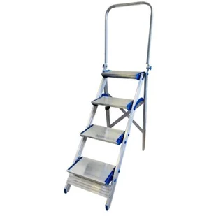 Solidne schodki aluminiowe z jednostronnym wejściem do zastosowań w domu, biurze, magazynie, sklepie. Składane w szybki i wygodny sposób. Wyposażone w składaną poręcz ułatwiającą pracę. Antypoślizgowa powierzchnia wszystkich stopni. Odpowiada normie PN-EN 14183.