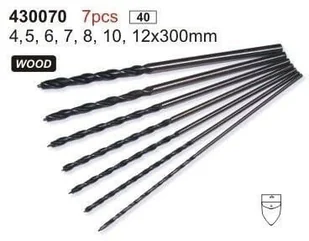 5907698012511, GTC-430070. Czas wysyłki: dni. Waga: 0. 58 kg. Zestaw prostych długich wierteł do drewna, 7 sztuk. Rozmiary: 4; 5; 6; 7; 8; 10; 12 mm, długość: 300 mm.