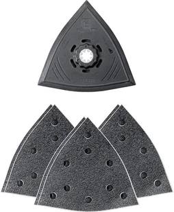FEIN Zestaw do szlifowania z 1 perforowaną trójkątną podkładką (długość krawędzi 130 mm), 2 arkuszami ściernymi dla każdego rodzaju ziarna 60, 80, 180. Złącze Stralock Plus, długość krawędzi 130 mm
