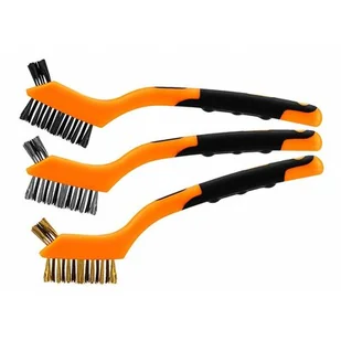 Szczotki druciane NEO (nr ref. 39-100) to zestaw zawierający 3 sztuki szczotek: stalową, mosiężną oraz nylonową. Szczotki stalowa i mosiężna służą do oczyszczania powierzchni ze szczególnie uporczywych zabrudzeń, a nylonowa do usuwania lżejszych zabrudzeń. Dwukomponentowy antypoślizgowy uchwyt sprawia, że produkt nie wyślizguje się z dłoni.