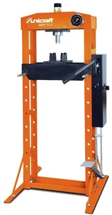 - Mocna spawana rama z perforacją: dzisięciostopniowa regulacja wysokości stołu prasy z bolcami ustalającymi