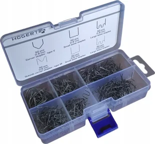 Opis produktu: Zestaw zszywek do zgrzewarki tworzyw sztucznych składa się z 300 sztuk zszywek podzielonych na 6 różnych typów. Zestaw ten jest dedykowany do spawarki tworzyw sztucznych HT2C081. Charakterystyka: W skład zestawu wchodzą: zszywka falista duża 0,6 mm - 50 szt. zszywka falista duża 0,8 mm - 50 szt. zszywka falista mała 0,6 mm - 50 szt. zszywka falista mała 0,8 mm - 50 szt. zszywka typu M - 50 szt. (do łączenie elementów po kątem od zewnętrznej strony) zszywka typu V 0,8 mm - 50 szt. (do zgrzewania elementów pod kątem, od wewnętrznej strony).