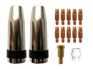 Zestaw części do uchwytu spawalniczego MB 24. 2 dysze gazowe, 5 końcówek prądowych fi 0,8 mm, 5 końcówek prądowych fi 1,0 mm, 1 łącznik prądowy, 1 dyfuzor ceramiczny gazu.