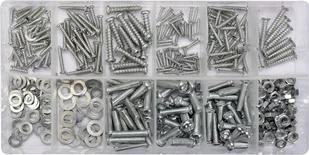 Zestaw 347 sztuk wkrętów, nakrętek, śrub i podkładek zawiera podstawowe rozmiary przydatne zarówno w warsztacie, jak i gospodarstwie domowym. Całość umieszczono w wygodnym opakowaniu typu "sortownik".