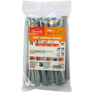 Kołek do szybkiego montażu 10 x 140 mm 10 szt. Wkręt-met pozwala na ekspresowe mocowanie różnego rodzaju elementów, zarówno dekoracyjnych, wykończeniowych jak i konstrukcyjnych. Stosowanie jest banalnie proste - wystarczy wbić kołek wraz z wkrętem w przygotowany wcześniej otwór montażowy w elemencie mocowanym oraz w podłożu. Poprawne i trwałe mocowanie za pomocą kołków szybkiego montażu jest możliwe tylko przy wykonaniu otworów zgodnie ze wskazaniami na opakowaniu (średnica i głębokość otworu, grubość mocowanego elementu)