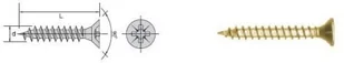 Wkręt do drewna i płyt wiórowych z łbem stożkowym płaskim ocynkowany na żółto , z nacięciem krzyżowym pozidrive , hartowany , woskowany , z pełnym gwintem , - opakowanie pudełko 200 szt , - 1 kg - ok. 200 szt . EAN: 5902134200293 Waga: 0.