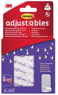 Repozycjonowalne klipsy i haczyki Command(TM)Adjustables(TM) są łatwe w użyciu i można je przeklejać do 3 razy w ciągu pierwszych 20 minut. Dyskretne, przezroczyste klipsy i haczyki idealnie komponują się z wystrojem. Łatwe w aplikacji, nie wymagają gwoździ, wkrętów ani wierteł. Idealne się do większości gładkich powierzchni, w tym malowanych ścian, płytek, metalu i drewna.