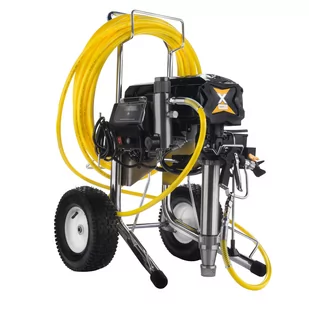 WT51 ma na tyle wydajną pompę, że możemy nim malować na dwa stanowiska malarskie przy użyciu trójnika. Przy użyciu agregatu można malować praktycznie wszystkie podłoża budowlane, takie jak ściany i sufity wewnątrz i na zewnątrz budynków mieszkalnych i przemysłowych; elewacje; różnego rodzaju konstrukcje drewniane, metalowe i inne. Agregat malarski jest wyposażony w ruchomą stopę przy pomocy której można sprzęt przechylić i oprzeć pod kątem. Dzięki temu zabiegowi wyciągnięcie lub włożenie wiadra z materiałem staję się jeszcze łatwiejsze zwłaszcza przy pracy samemu. Malowanie przy użyciu agregatu naszej produkcji polega na sprężeniu FARBY i jej natrysku na malowane powierzchnie bez użycia powietrza.