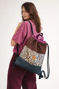 Kolorowy plecak worek z modnym motywem panterki, łączący różne faktury i odcienie. Lekki, pojemny i wygodny – idealny na co dzień, zakupy lub spacer. Stylowy dodatek do miejskich i casualowych styliza ...