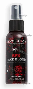 SFX FAKE BLOOD marki MAKEUP REVOLUTION. Sztuczna krew. To niezastąpiony produkt podczas wykonywania wielu charakteryzacji i make-up'ów m. in. na zabawy Halloween'owe bądź różne eventy. Posiada intensywnie czerwony odcień, który doskonale imituje efekt świeżej krwi, zaś dzięki opakowaniu z atomizerem można bez problemu osiągnąć efekt rozpryśniętej krwi np na twarzy, ciele oraz koło sztucznych blizn i ran.