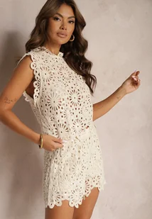Beżowy 2-Częściowy Komplet Ażurowy Top ze Stójką Szorty z Gumką w Pasie Rivassea