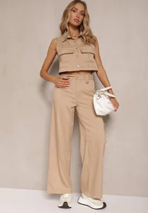 Beżowy Komplet Koszulowa Kamizelka i Spodnie o Szerokim Kroju w Stylu Cargo Zibelle