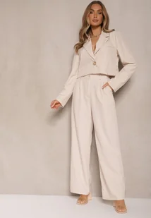 Beżowy Komplet o Garniturowym Kroju ze Spodniami i Marynarką z Broszką Ravkio
