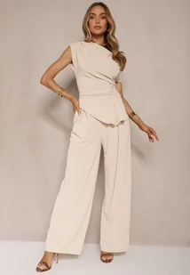 Beżowy Komplet Spodnie o Szerokim Kroju i Asymetryczna Bluzka z Marszczeniem Nitara
