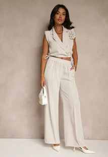 Beżowy Komplet Kopertowa Bluzka z Kwiatową Broszką i Szerokie Spodnie Reavilia