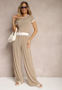 Beżowy Komplet z Prążkowanego Materiału T-shirt Szerokie Spodnie z Gumką w Pasie Alandrea