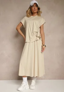 Beżowy Komplet z Wiskozą Spódnica i Bluzka z Wiązaniem Davissael