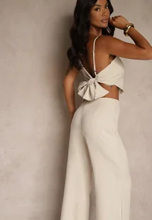 Beżowy Komplet z Wiskozą Spodnie o Szerokim Kroju i Asymetryczna Bluzka Dolessea