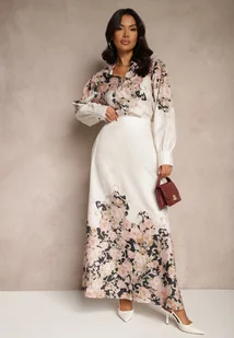 Beżowy Wiskozowy Komplet w Kwiatowy Wzór Koszula i Rozkloszowana Spódnica Belinoris