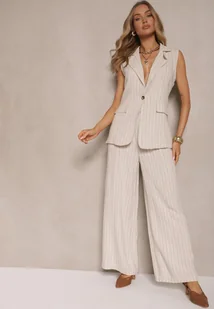 Beżowy Prążkowany Komplet z Wiskozą w Garniturowym Stylu Kamizelka i Spodnie Saralisse