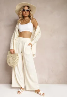 Beżowy Wiskozowy Komplet Spodnie z Szerokimi Nogawkami i Gumką w Talii Koszula na Guziki Tinamars