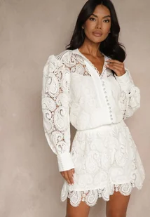 Biały Komplet z Bawełną Koszula i Szorty Ozdobione Ażurowym Wzorem Zeralea