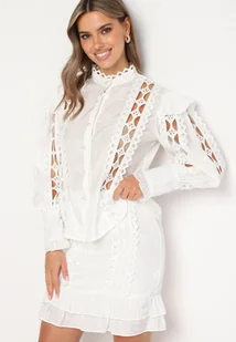 Biały Ażurowy Komplet z Dodatkiem Bawełny Koszula z Perełkowymi Guzikami i Spódnica Leniyana
