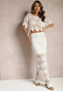 Biały Bawełniany Komplet Boho z Ażurowymi Wycięciami Spódnica Maxi i Bluzka Belrina