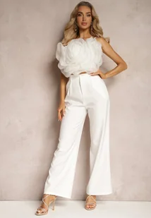 Biały Komplet Garniturowe Spodnie Top z Aplikacją 3D na Regulowanych Ramiączkach Grendlea