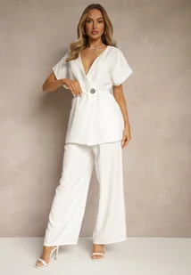 Biały Komplet Garniturowy Szerokie Spodnie i Marynarka z Paskiem Solsedi