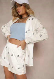 Biały Komplet Szorty i Koszula z Wiskozy i Bawełny w Haftowane Małe Kwiaty Olirwena