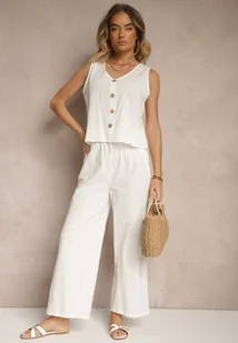 Biały Komplet Bawełniany Koszulka bez Rękawów z Guzikami Spodnie z Gumką w Pasie Juliancella