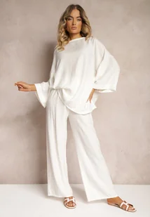 Biały Komplet z Wiskozy Bluzka o Kroju Nietoperza i Szerokie Spodnie Qadrina