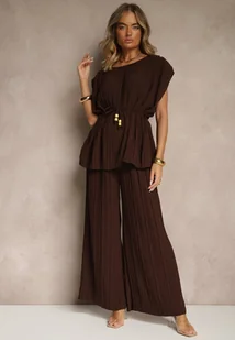 Brązowy Komplet Spodnie o Szerokim Kroju i Bluzka z Usztywnioną Linią Ramion Nilamira