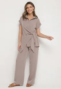 Ciemnobeżowy Komplet Koszula z Asymetrycznym Wiązaniem i Szerokie Spodnie Filivara