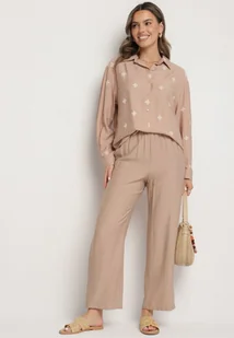 Ciemnobeżowy Komplet z Wiskozy o Kroju Oversize Koszula z Haftem i Spodnie Sadeonna